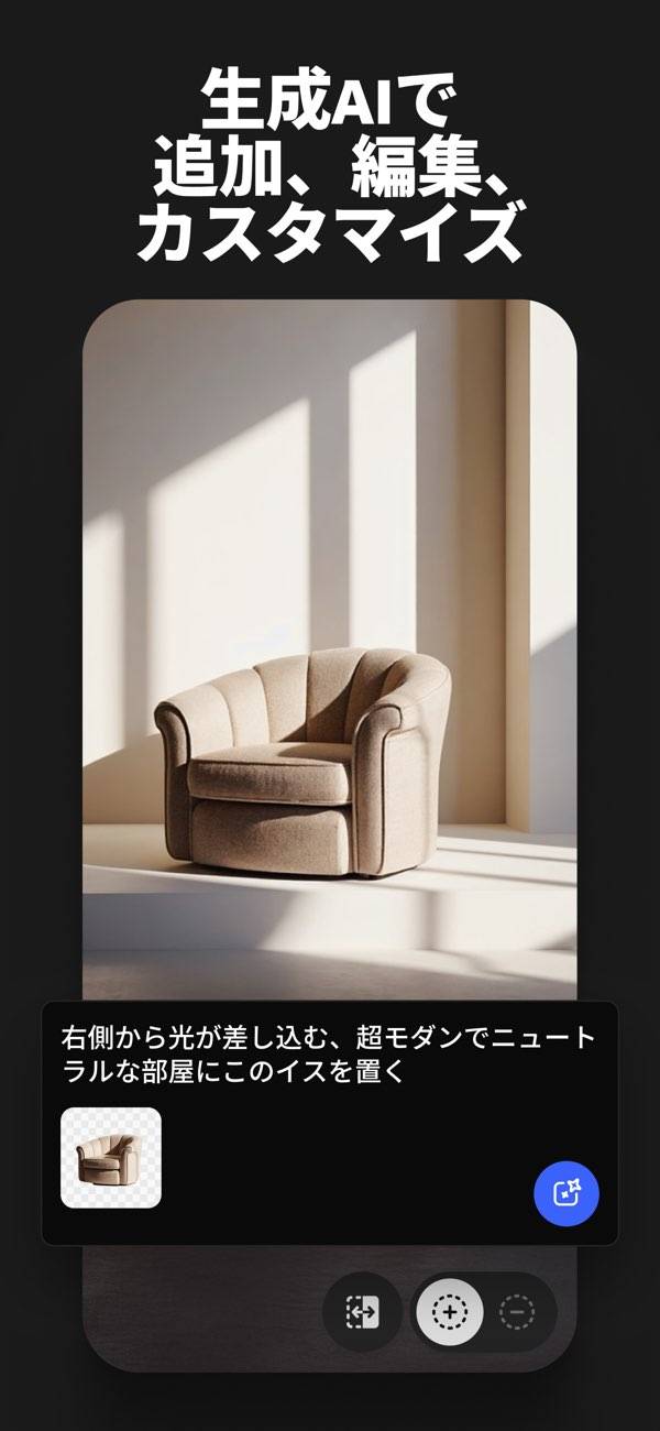 生成したあとから、画像の絵柄や構成といった部分をワンタップで調整可能。例えば、遠目に被写体を起きたい、イラストをもっとポップにしたいというような要望を叶えてくれます。また、自分が持っている素材を参照させることもでき、よりイメージに近い絵柄や構図にできます。
