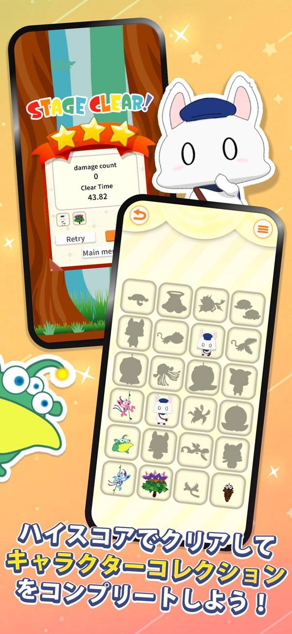 お邪魔キャラクター含めどのキャラクターも愛らしく、見ているだけで癒やされる雰囲気が特徴的。一方でノーダメージクリアを目指すという楽しみも用意されています。