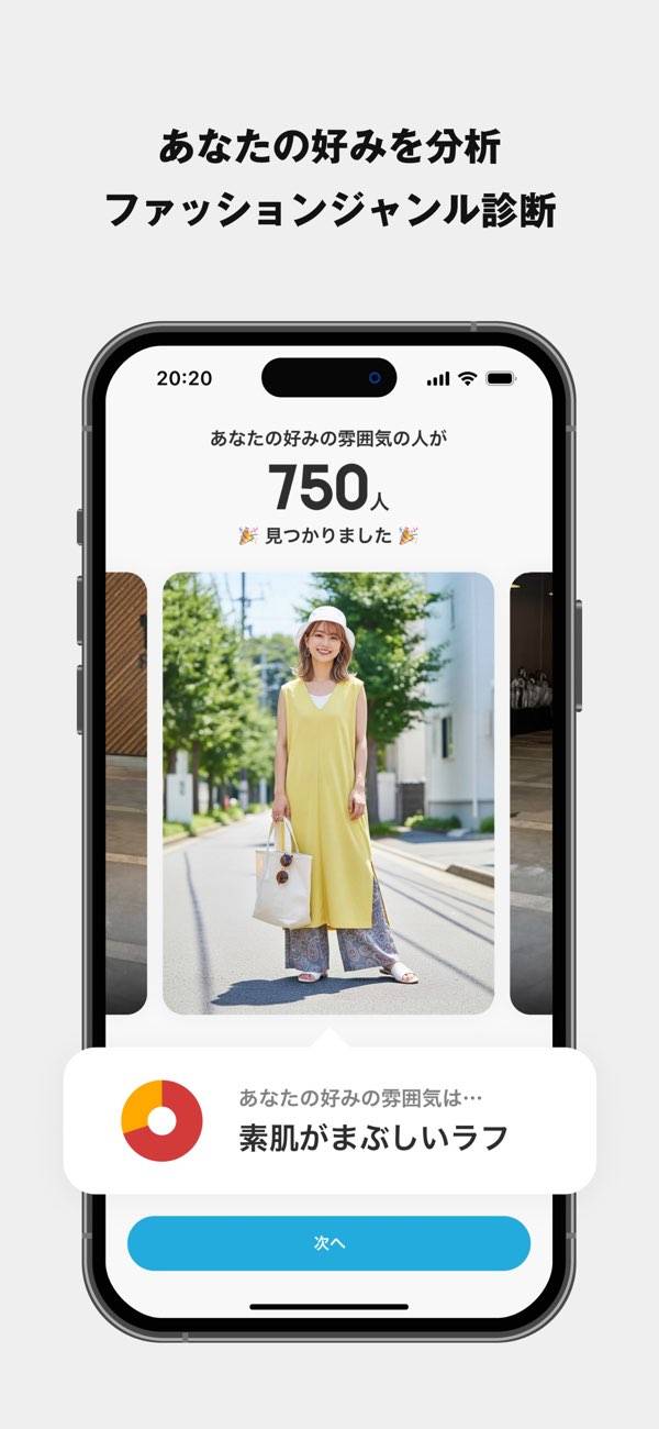 全身写真とファッション嗜好をもとにしたマッチングアプリです。ユーザー全員が全身写真を登録しているため相手の雰囲気を事前に把握でき、実際に会った時のガッカリ感が大幅に軽減されます。さらにファッションジャンル診断を行うと、あなた好みの服装の異性をAIが毎日おすすめしてくれます。