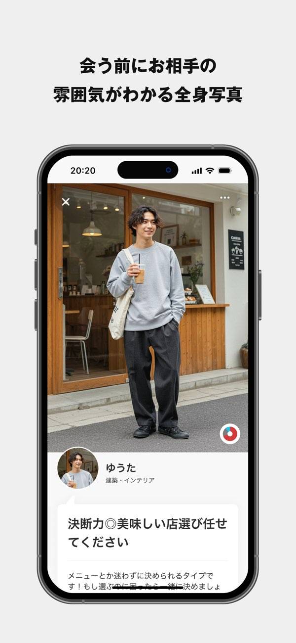 - 全身写真で相手の雰囲気を事前に把握。出会い時のギャップを大幅軽減