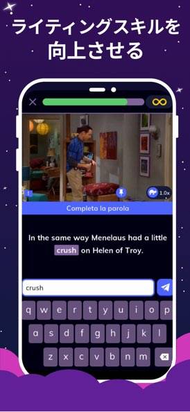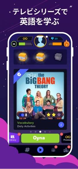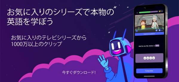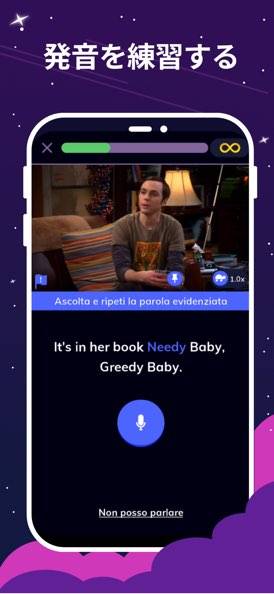 海外のドラマやアニメを題材に英語を学べるアプリです。レベルは「Good morning」の初心者レベルから、上級レベルまで幅広く対応。海外ドラマのワンシーンが、英語のリスニング・スピーキングの教材として登場します。