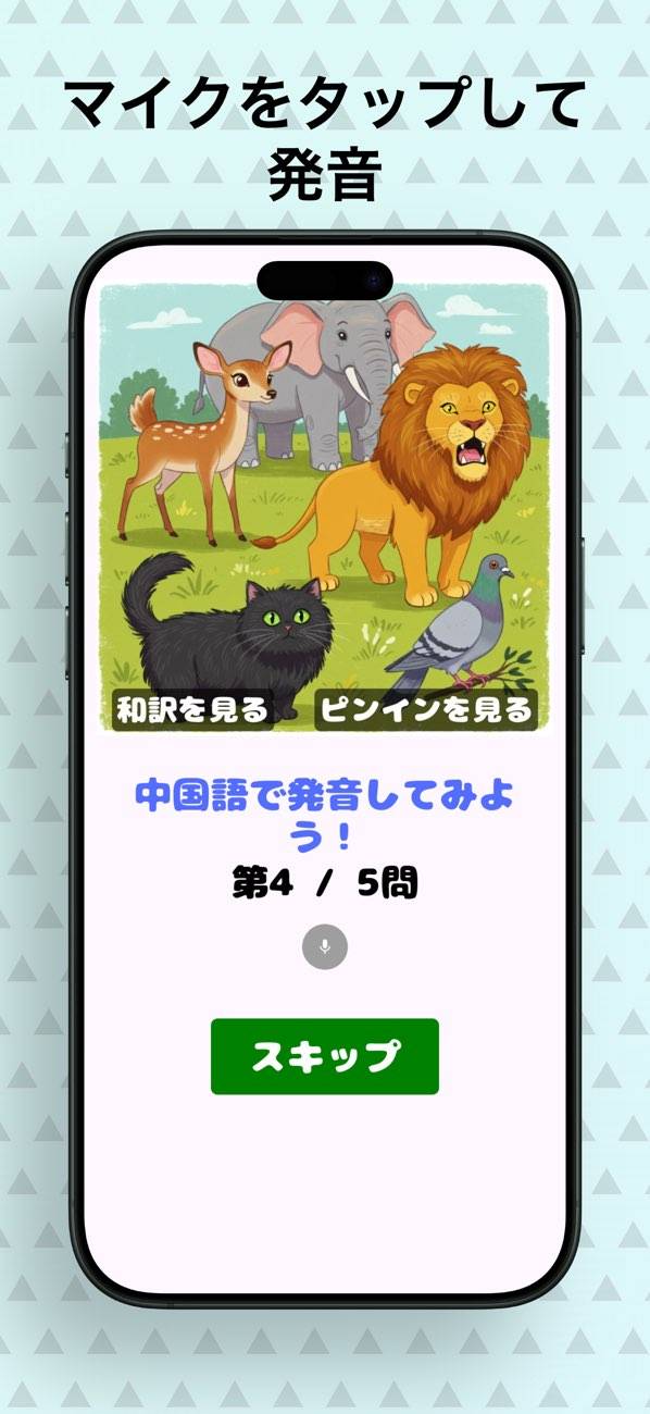 中国語の基礎を一通り学んだら、発音強化に本アプリの出番です。イラストを見て、それに対応する単語を中国語で発声していきます。1回5問方式で、ちょっとした空き時間に発音練習が可能。