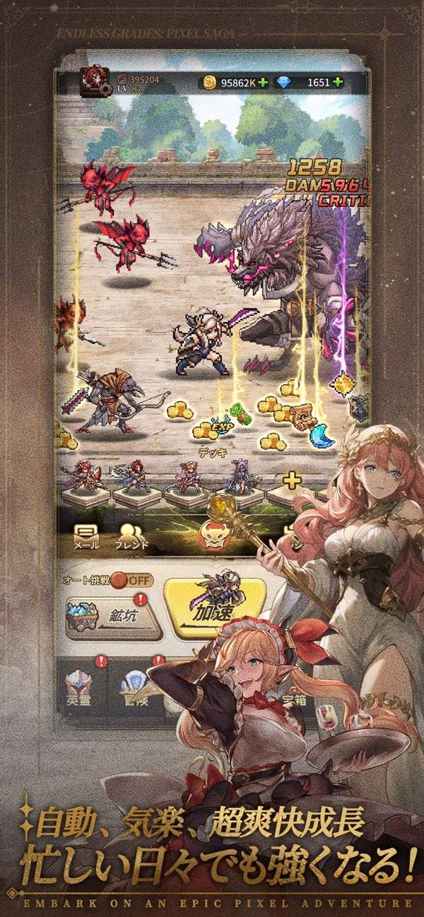遺伝子レベルでドット絵の魅力が刻まれている人のための放置RPGです。世界を救うため、ヴァルキリーが英霊とともに躍動します。滑らかなドット絵のアニメーションは必見。