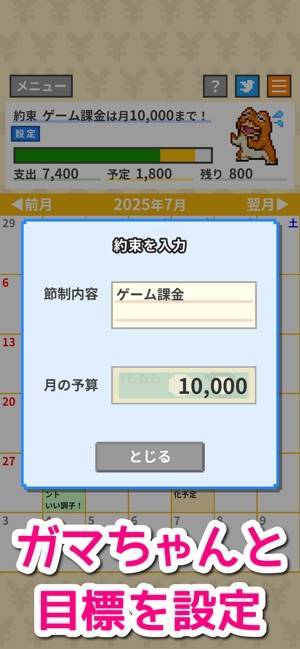 支出が設定金額に近づくに連れ、ガマちゃんが焦っていきます。心なしか体も痩せているような……。これは申し訳なさで出費を抑える気になりますね。
