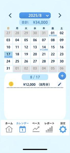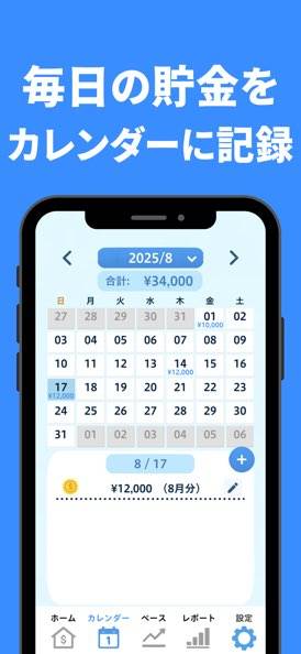 貯金の記録がカレンダー上に残ります。例えば給料日に合わせて貯金をすれば「来月も貯金をしよう」というモチベーションに。