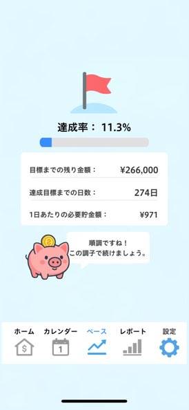 さらに、貯金達成までの達成率も数値化。具体的にあと何円分がんばればいいのかわかれば、俄然やる気が出ること請け合いです。