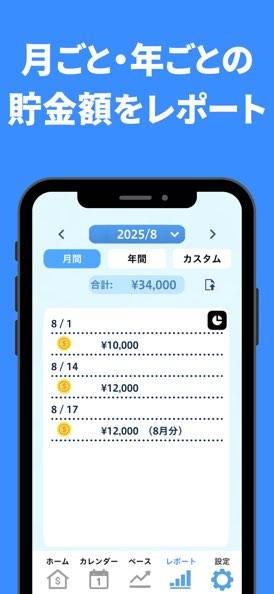 月間、年間の貯金額のグラフ表示機能も搭載されています。これも貯金のモチベーションを高めてくれる機能のひとつ。たとえ少しずつの貯金でも、コツコツ積み重ねていけば立派なグラフに。