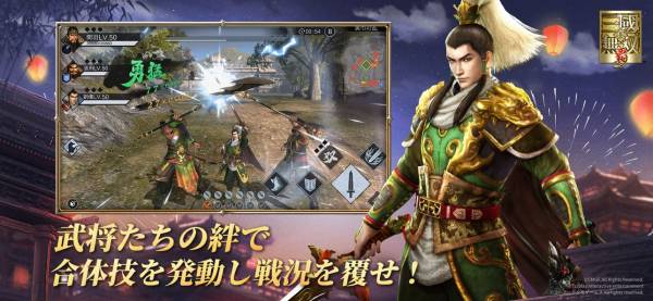 武将の組み合わせによって能力が上昇する「絆」システムを搭載。特定の組み合わせでは、戦況を一変させる「合体技」が発動可能です。お気に入りの武将同士を組み合わせることで、自分だけの戦略を楽しめるのもポイント。