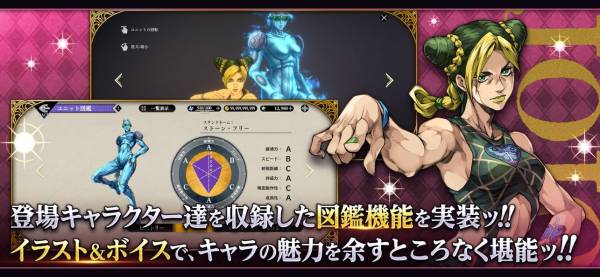 アビリティではキャラとスタンドの迫力ある姿が見られます。美麗な3DCGで描かれるキャラお馴染みのセリフと共に繰り出される、容赦ない大技をぜひ体感してください。