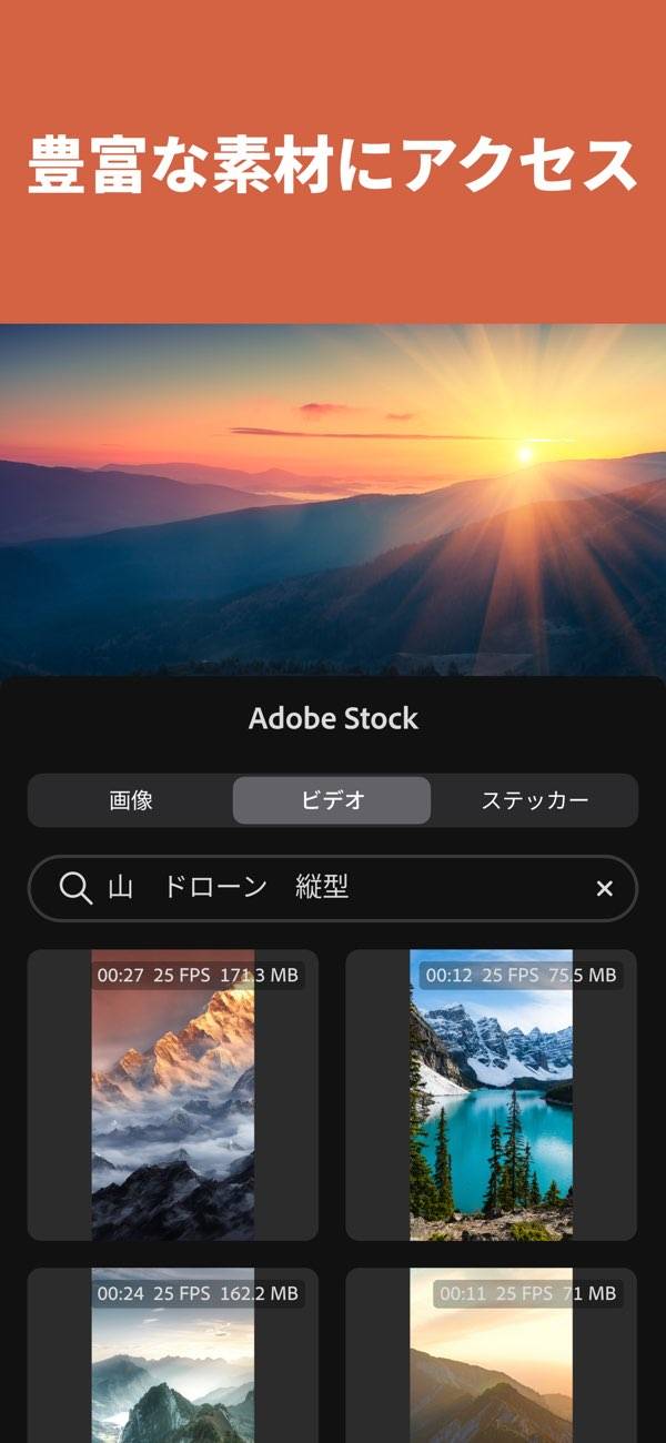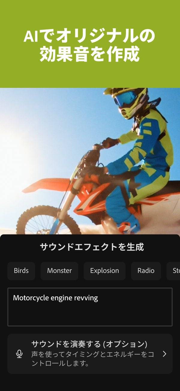 テキスト入力からユニークなステッカーや背景を生成できるAI機能を搭載。背景を拡張したり補正したりすることで、手持ちの映像をさらに魅力的に仕上げられるのもポイントです。また「Adobe Firefly」を利用することで、商用利用可能なコンテンツをスピーディに制作できます。
