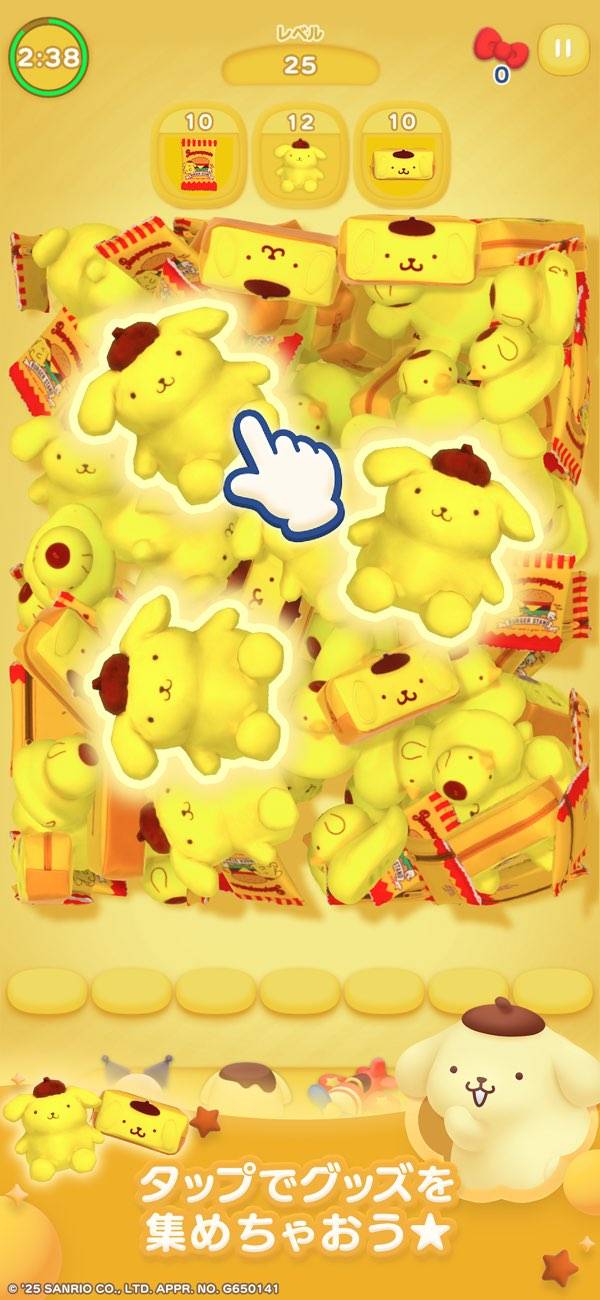 散らばったグッズの中から、同じグッズを3つ集めてマッチ。画面上部に表示されているお題のグッズをすべて消すとクリアです。サンリオキャラクターのグッズで画面が溢れ、とてもかわいらしいです。