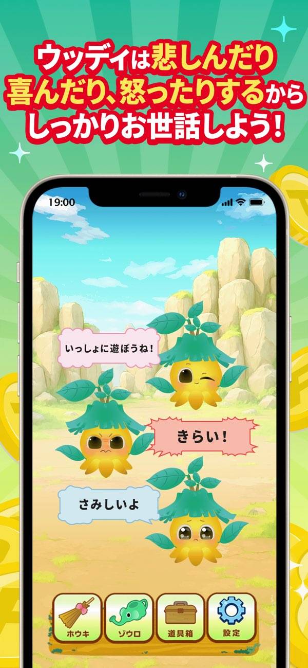 金・銀のドングリを生み出すウッディを育成しましょう。放置すると現れる黒いガイチュウをダブルタップで駆除。ゾウロで水やり、ホウキで掃除をすると、換金アイテムを落としてくれます。喜んだり踊ったり、表情豊かな姿に愛着が湧きやすいですよ。