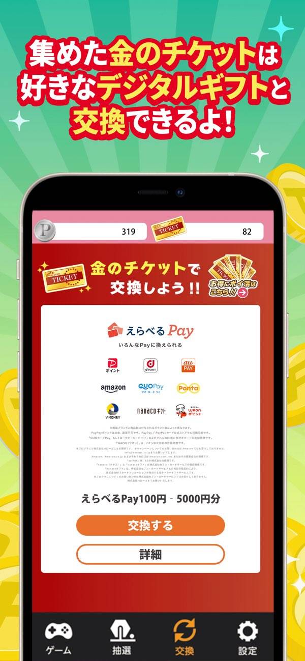 銀のドングリ(ポイント)で抽選参加、金のドングリ(金のチケット)でお小遣い稼ぎが可能。金のチケットは各種Payに交換できます。お世話の頻度にもよりますが、速ければ数十日で最低レート2,100枚に届きます。