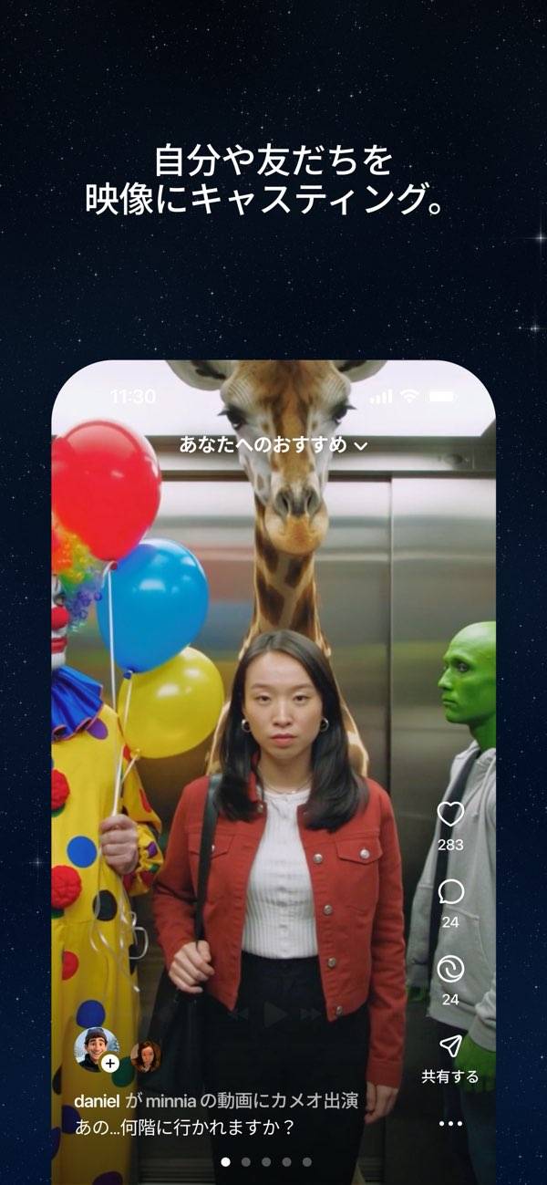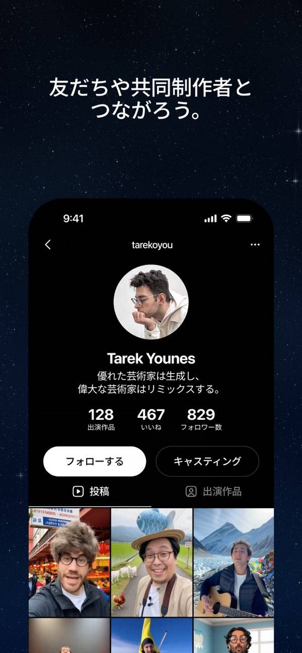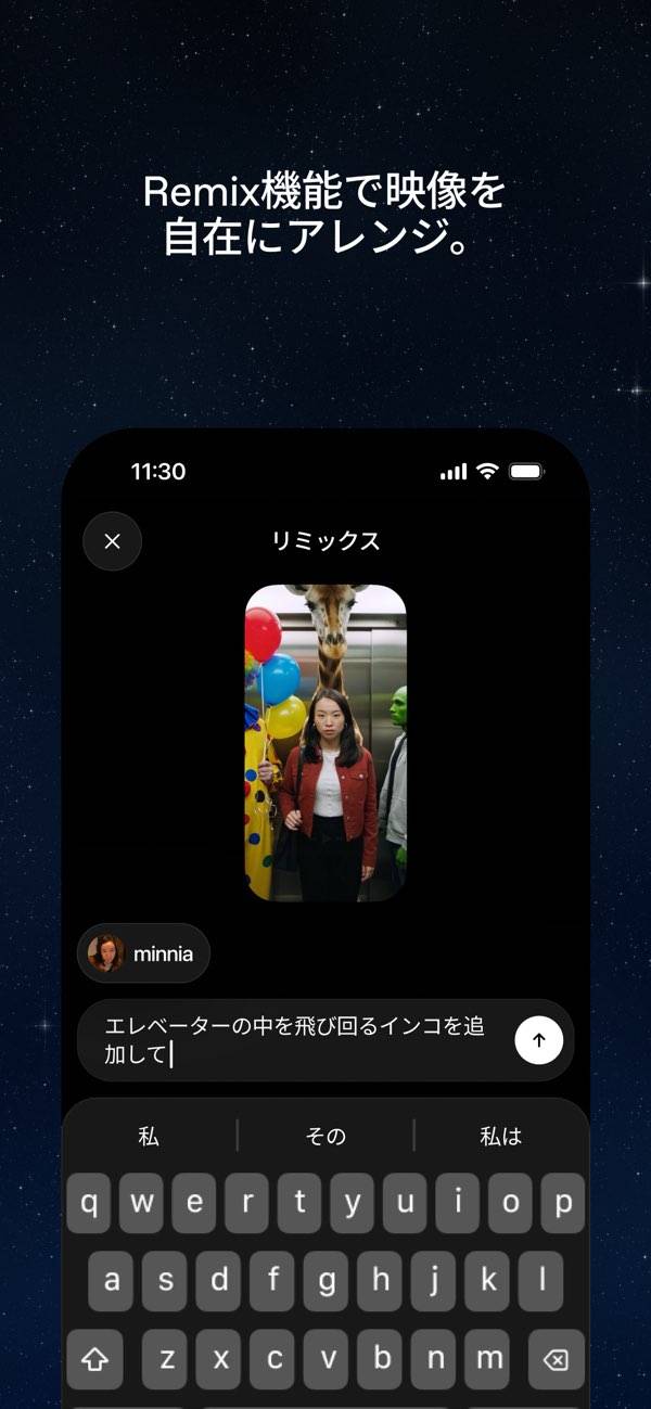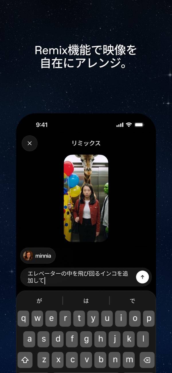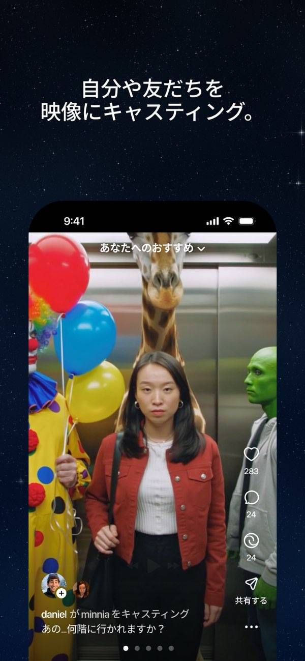 ほかのユーザーが作った動画を自分らしく作り変えて楽しめます。キャラを変えたり、話の続きを加えたり、新しい雰囲気に仕上げたりと自由にリミックス可能。ひらめいたアイデアをすぐに形にできるので、見るだけでなく自分で参加する楽しさがあります。