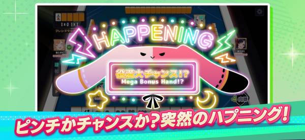 対局開始時、ハプニングの内容を決めるルーレットが出現! ツモ時に手配が2枚入れ替わる「ツモツモチェンジ」、ドラがすべてめくれた状態になる「ドラばらチャンス」など内容はランダム。毎度何が起きるのかワクワクさせてくれます。