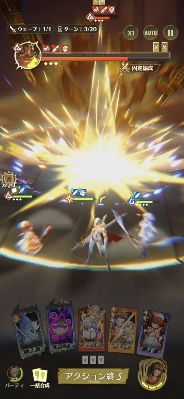 基本的なバトルはターン制で進行し、カードの合成・発動を繰り返す戦略的なシステムになっています。それぞれのアウラス(味方ユニット)は属性と役割が決まっており、敵との相性や攻撃タイミングを把握して作戦を組み立てていく必要があります。