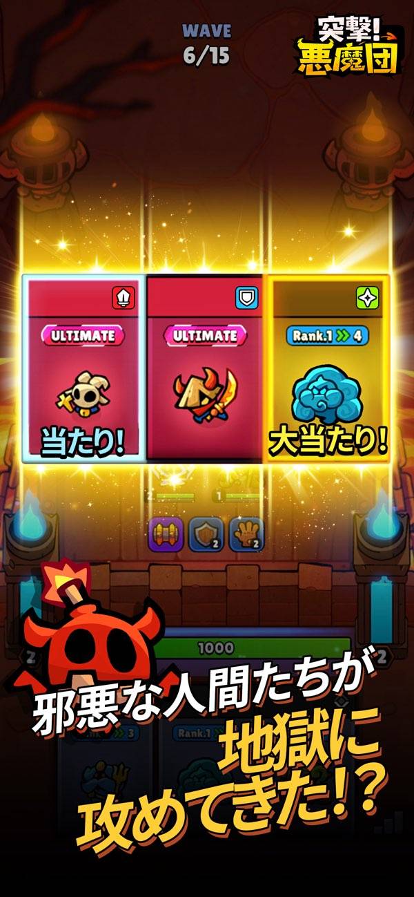 フィールド上に悪魔を配置して、どんどん攻めてくる人間たちを迎え撃ちます。バトルは時間とともに進行し、敵が次々と流れてくる中、キャラの配置や順番が勝敗を左右します。強敵が混ざって現れることもあるため、どの悪魔をどこに出すかも重要。テンポよく進むので、短いスキマ時間にもピッタリです。