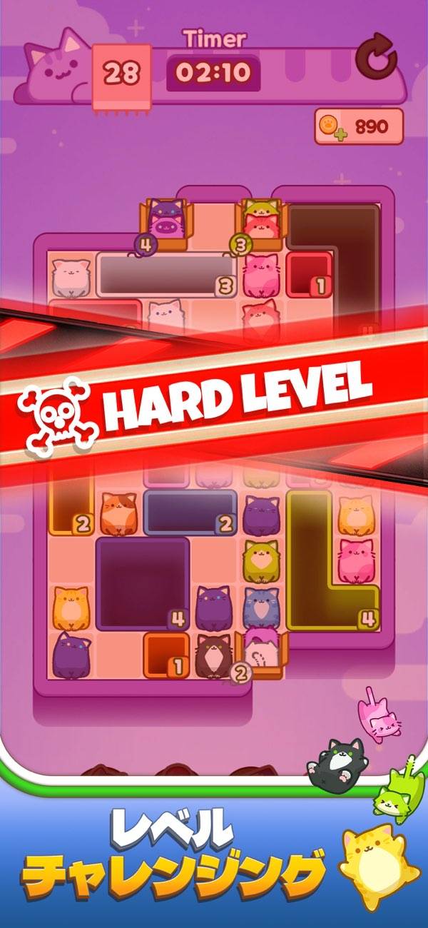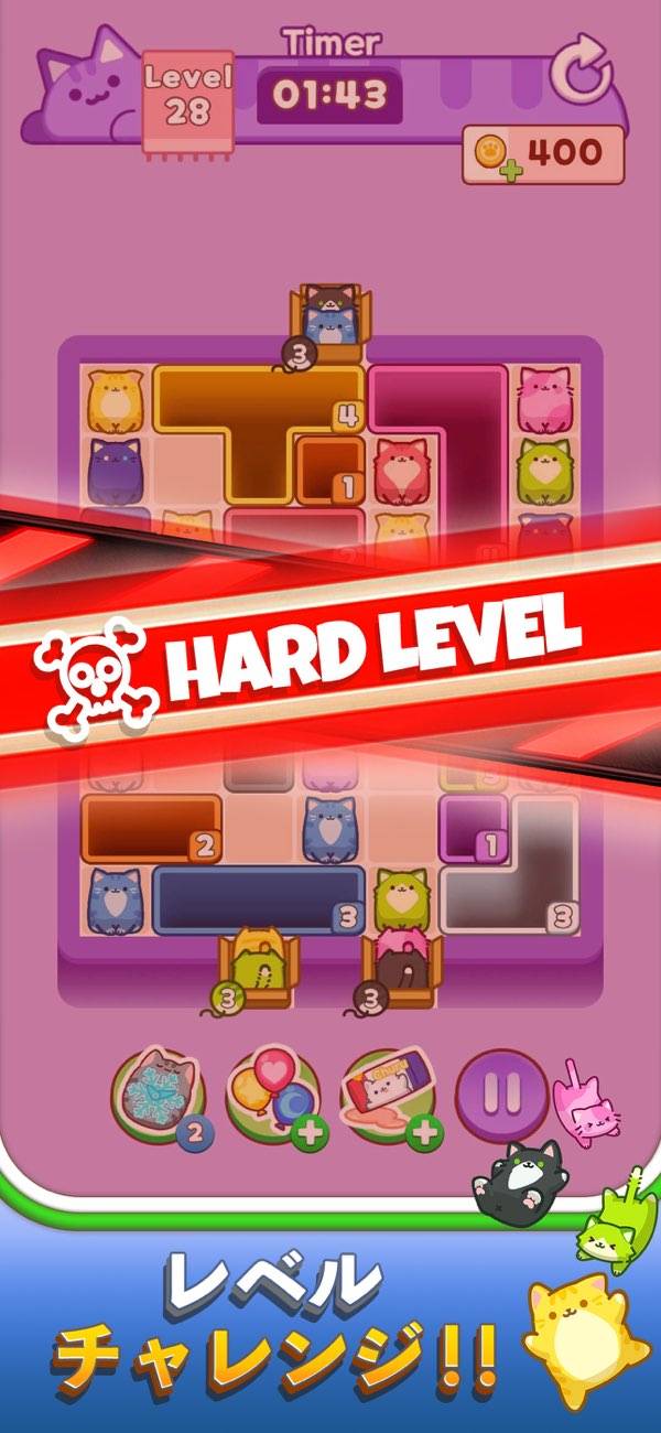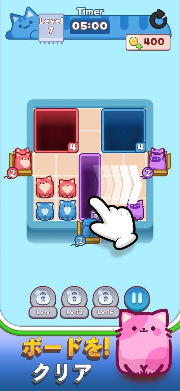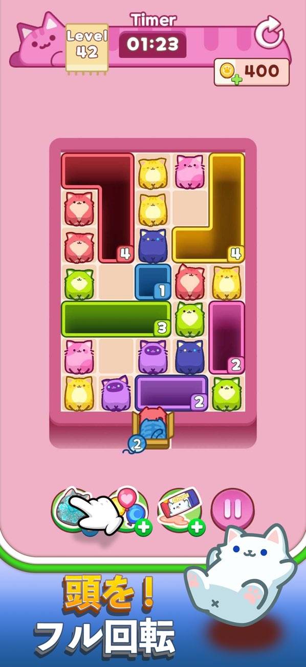 色のついた穴に同じ色のネコを落としていくカジュアルパズル。やることはシンプルですが、どのネコから落としていくか、どの順番だとうまくいくかを考えるのが楽しいポイントです。