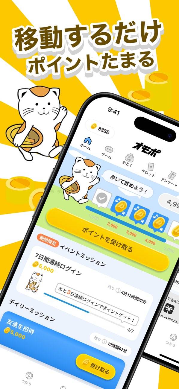 移動するだけでポイントがもらえるおトクアプリ。歩いた歩数に応じてポイントをもらえるほか、簡単なミッションやカジュアルゲーム、動画視聴でもポイントをゲット。AmazonギフトカードやPayPayポイントなど人気サービスに交換でき、お小遣い稼ぎが楽しく続けられます。