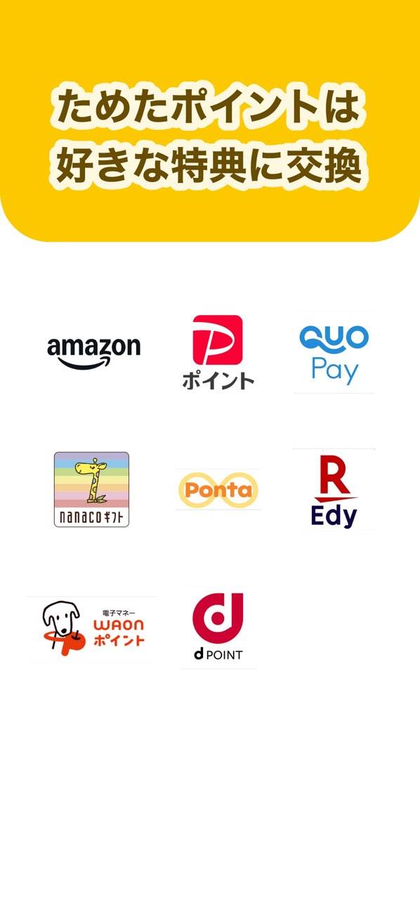 - 貯めたポイントはAmazonギフト券やPayPayポイントなどにすぐ交換