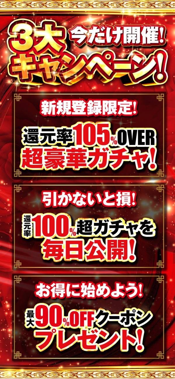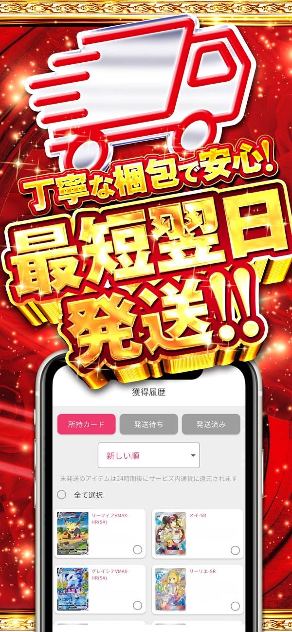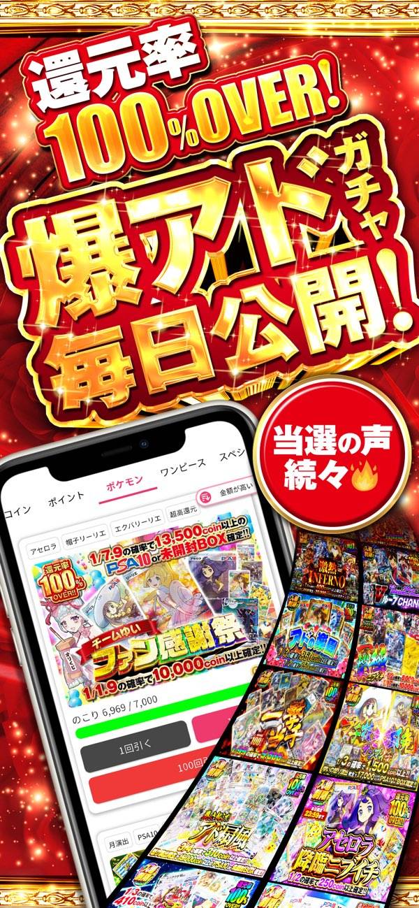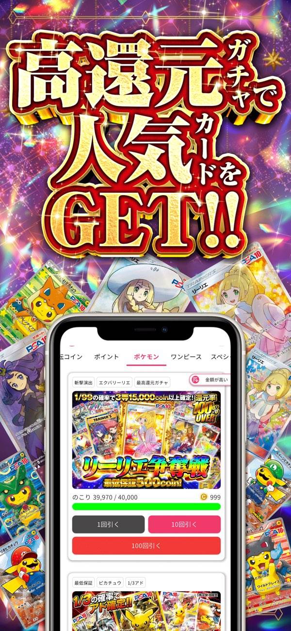 還元率が非常に高く、激レアなポケモンカードやワンピースカードが当たりやすいのが魅力。通常のガチャはもちろん、入場制限付き高還元ガチャではより手応えのある当たりにも期待できます。毎回ドキドキしながら引くことができ、レアカードを手に入れたときの喜びは格別です。
