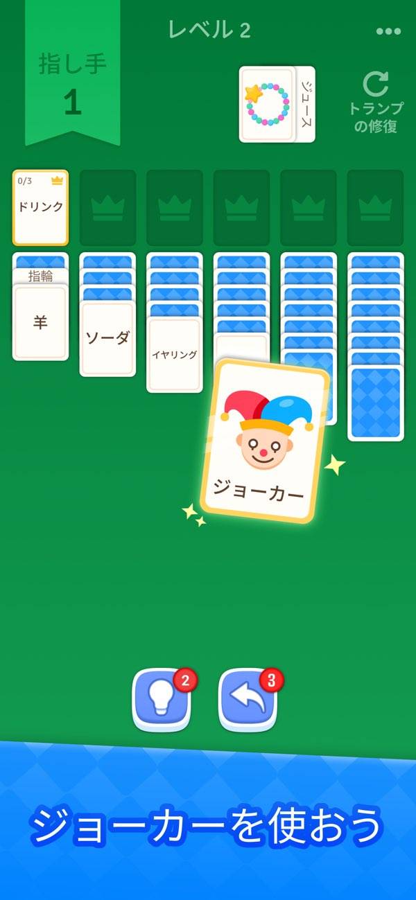 どうしても手が止まってしまったときには、ヒントボタンが頼りになります。カードの中からどれを動かせばいいかが示されるので、やり直す必要が出る前に軌道修正が可能。さらに、直前の操作を取り消せるアンドゥ機能もあるため、安心していろいろな並べ方を試せます。自分で考えながらも、つまずいたときは無理なく前に進めます。