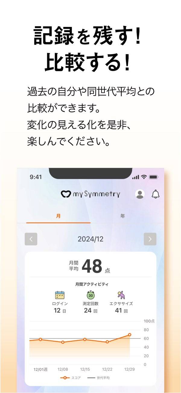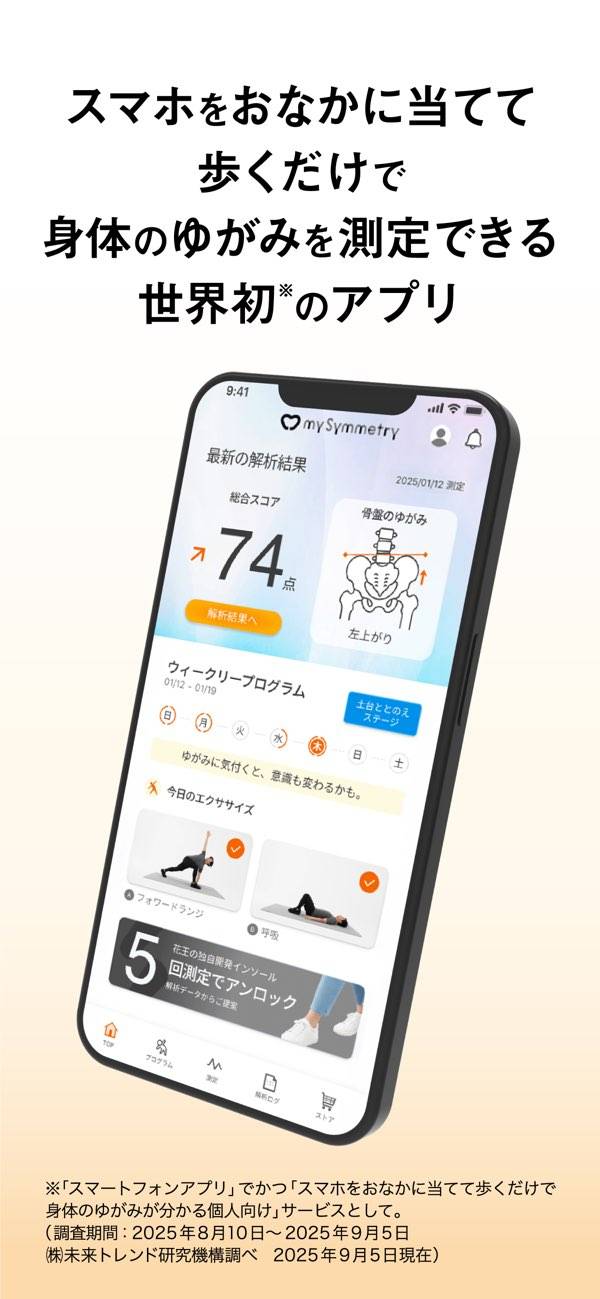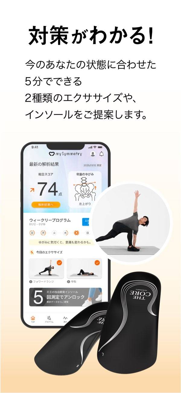 スマホを使って、体のバランスや骨盤のゆがみをチェックできるアプリです。歩行時の動きをアプリ内の専用センサーが読み取って、体の傾きや左右の差をスコア化。骨盤などの状態に合わせたエクササイズ動画が提案され、無理なく姿勢のクセ改善にアプローチできます。週に1回、5分程度のエクササイズの習慣を身に着ければ、ゆがみ解消につながりますよ。