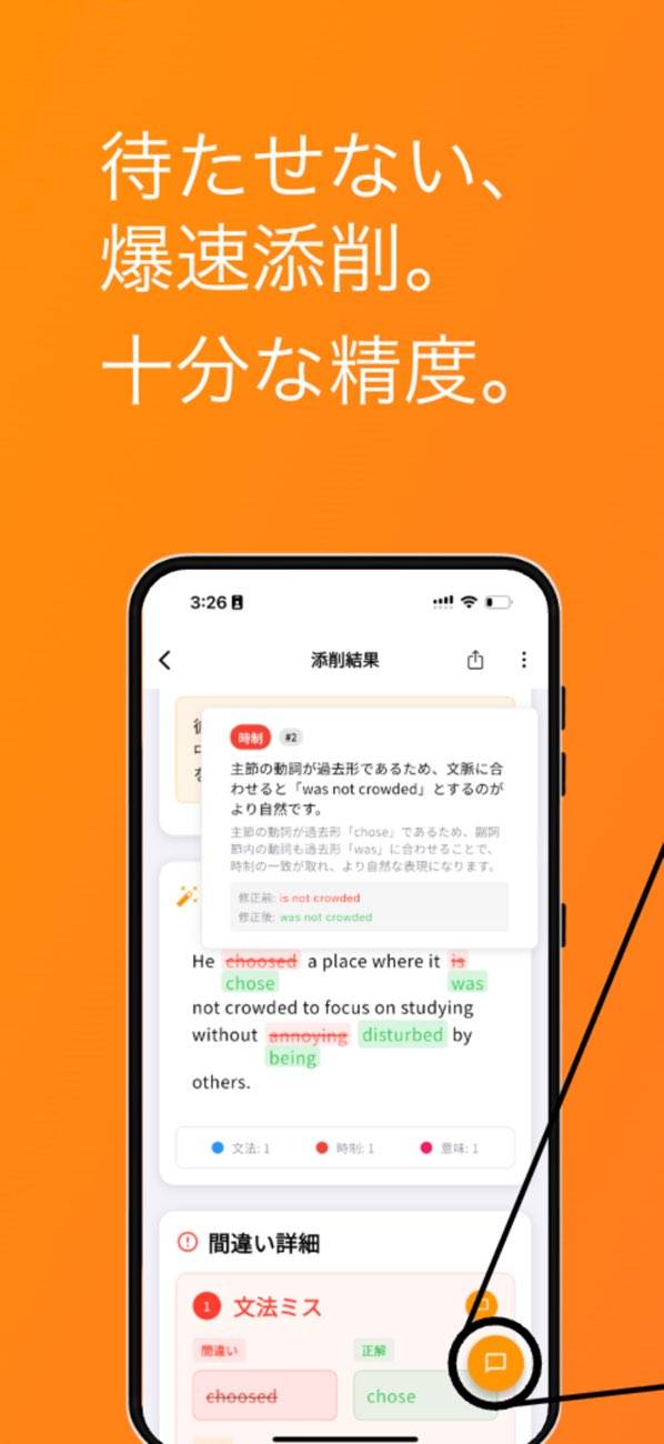 - 英文を入力するとAIがその場で添削。コメント付きですぐに直せる