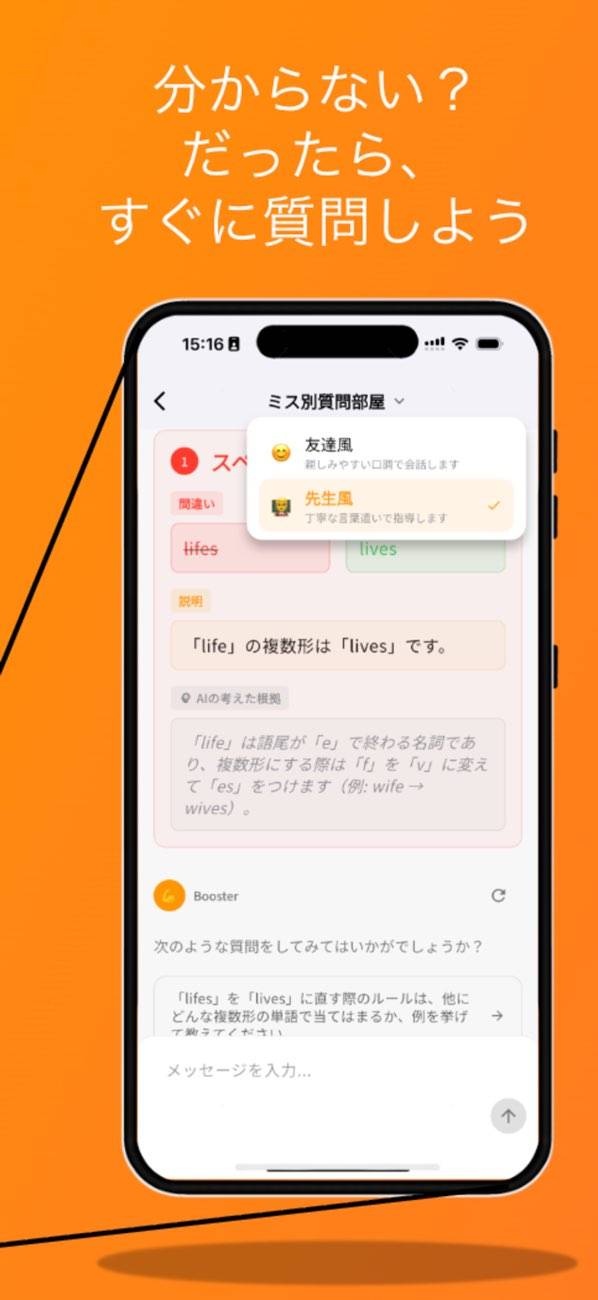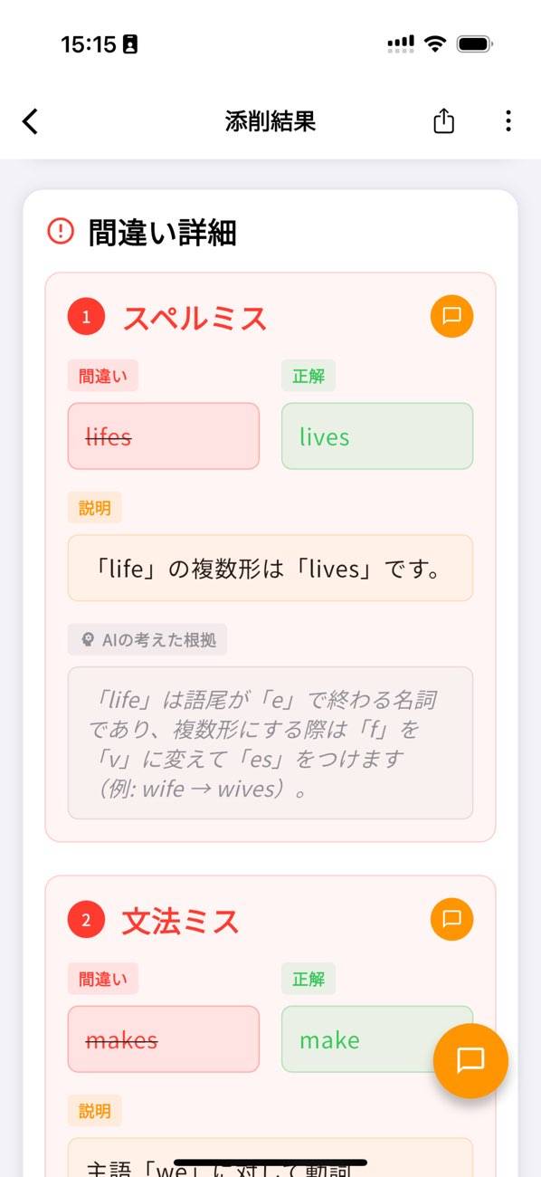 入力した英文はその場でAIがチェックし、ミスがあればすぐに指摘されます。たとえば単語のつづりや文の組み立て、言葉の使い方などを1つずつチェック。しかも「どうしてこの表現がよくないのか」という理由までわかりやすく説明してくれるので、ただ直すだけでなく、自然と注意すべきポイントが身に付きます。