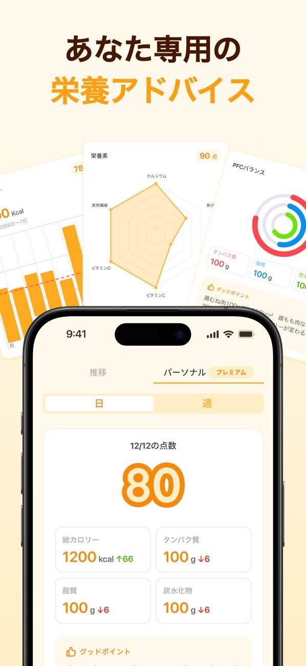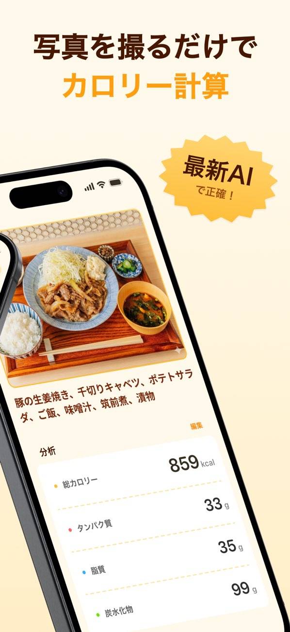 - 食事の写真を撮るだけで、カロリーやPFCバランスを自動で算出