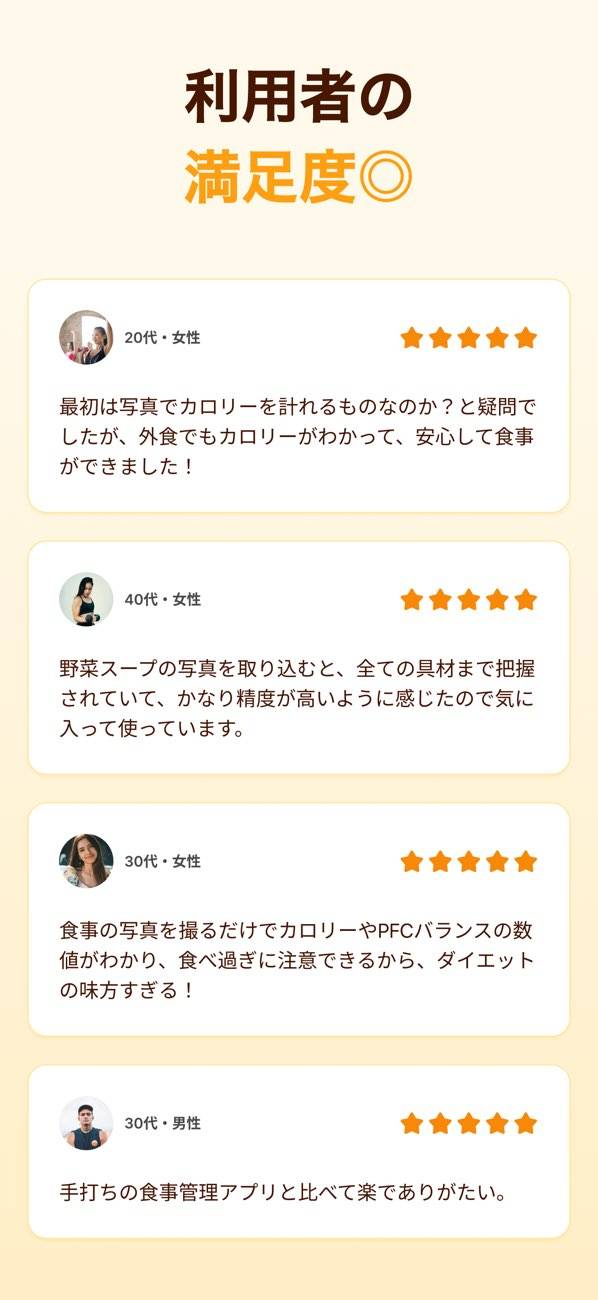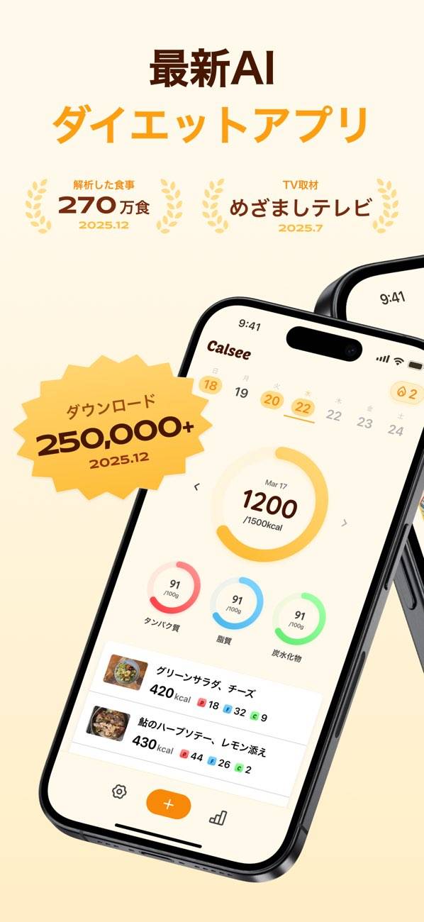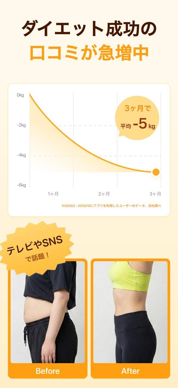 撮った食事の写真から、カロリーやPFC(たんぱく質・脂質・炭水化物)をAIが自動で解析してくれる食事管理アプリです。入力不要で手軽に記録できるため、毎日忙しい中でも無理なくダイエットを続けやすくなります。