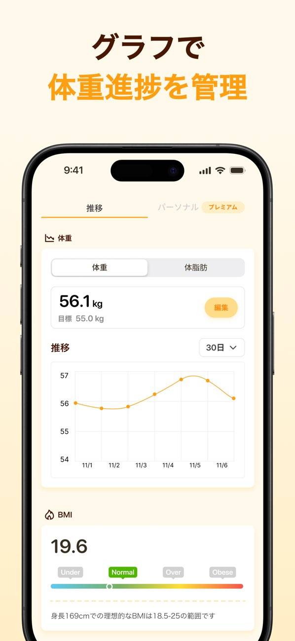 体重や体脂肪率のグラフで、日々どれくらい身体が変化してきたかひと目でわかります。少しずつでも数字が動いていくことで、頑張りが目に見えるようになってやる気がアップ。短期間のダイエットだけでなく、長く付き合える健康管理アプリとしても使えます。