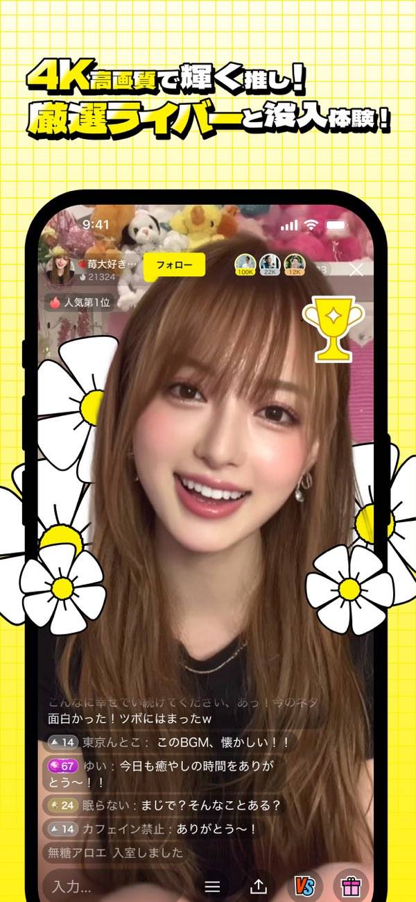映像は4Kの超高画質に対応していて、表情の変化や動きが細かく伝わります。画面越しでもライバーとの距離が近く感じられ、パフォーマンスの見所を逃しません。目の前で話してくれているような臨場感を存分に楽しみましょう。