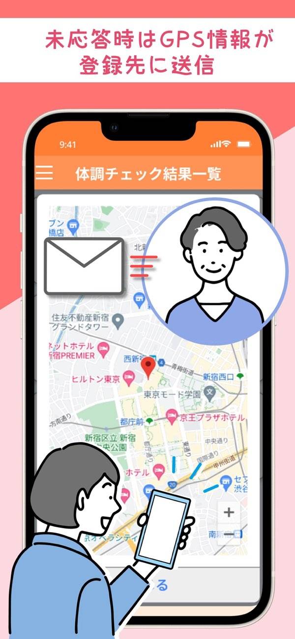 一人暮らしの毎日に、体調の記録と見守りをプラスしてくれるツールです。決まった時間に通知が届き、その日の体調を2つのボタンから選ぶだけで日々の調子を残せます。もし反応がない日が続いたときは、あらかじめ登録した連絡先へ位置情報付きで知らせてくれるので、家族に手間をかけずに安心して過ごせます。