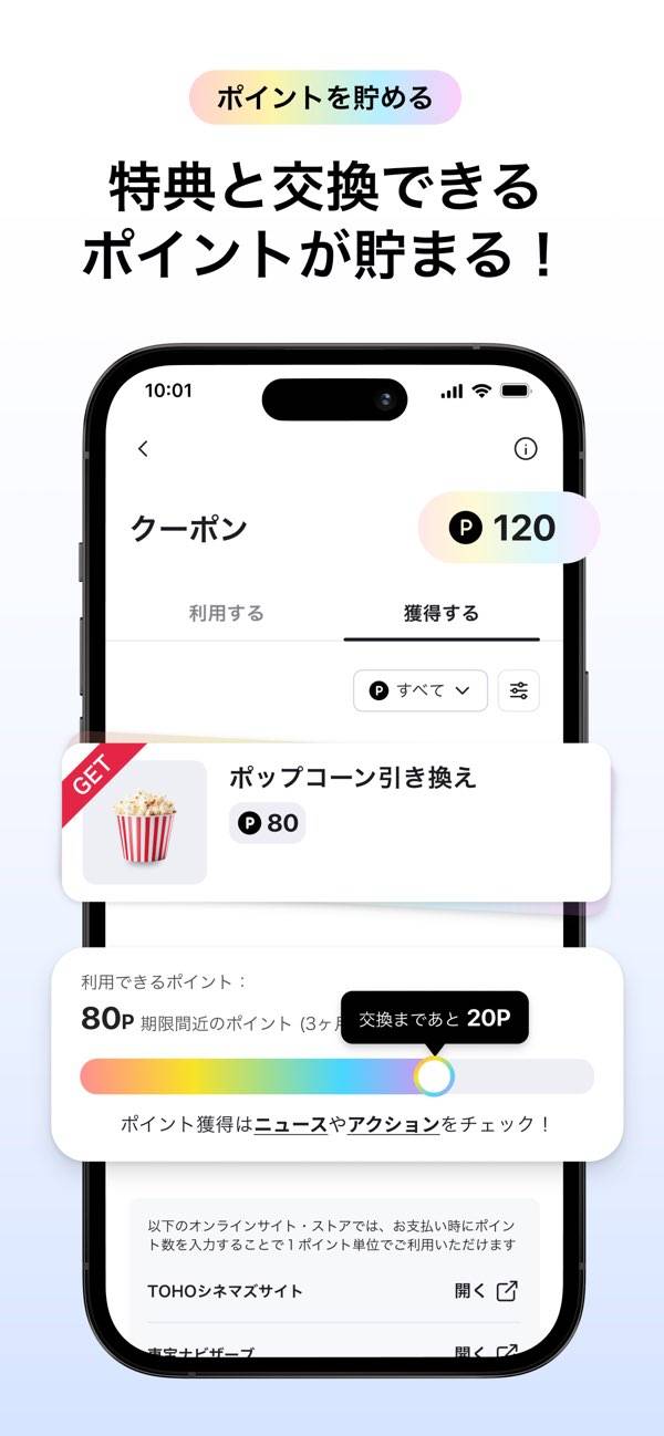 支払額に応じて貯まるポイントはクーポンや各種引換に使えます。ポイントの交換先には鑑賞券のほか、フードやドリンク、作品ごとのグッズなどがあり、選択肢が多いです。