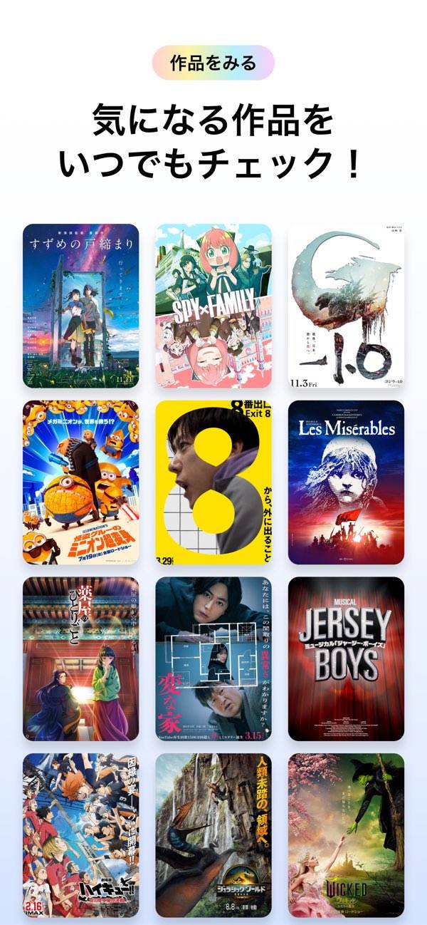 映画や演劇、アニメの作品情報を一覧で確認できます。ポスターがサムネイルになっている見やすい画面で、公開中と公開予定の作品を表示。次に観る候補を絞りやすい見た目になっているのが特長です。