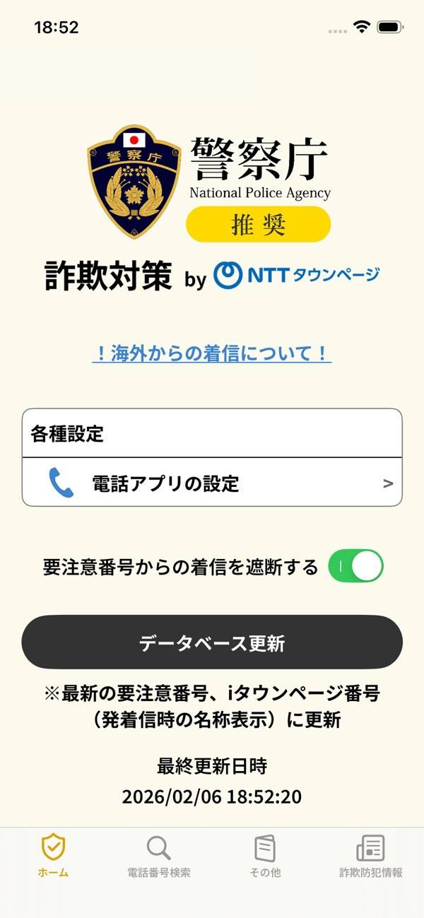 最新の特殊詐欺情報をアプリ内で確認でき、気になる番号は手動検索でも確かめられます。着信時の自動対策だけでなく、最新の手口を知っておけば、不審な話に気づきやすくなるでしょう。普段から情報を見ておくと、電話の内容をうのみにせず、家族とも防犯の話題を共有しやすくなります。