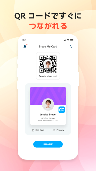 - アプリ内で自分の名刺デザインを作成。二次元コードで送受信もできる