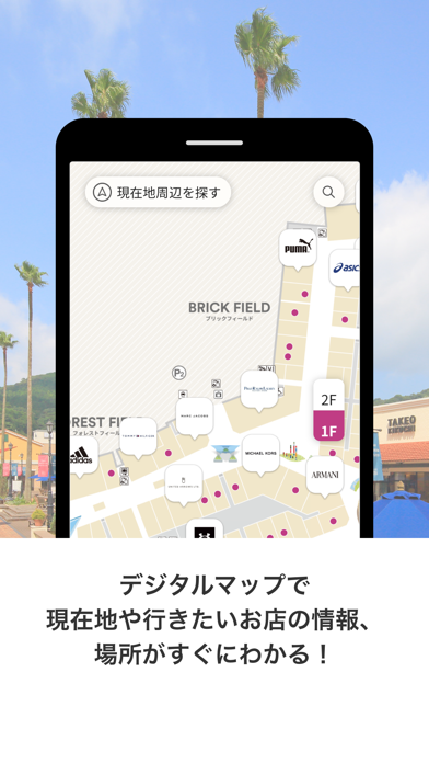 本アプリにはブランド検索機能が備わっています。キーワードもしくは一覧から該当のブランドを検索すると、店舗情報とともにフロアマップでお店の位置も確認可能。クーポン情報も一緒に掲載されているので、クーポンの確認も手軽に行えます。