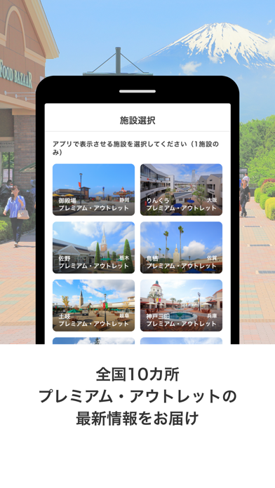 全国10ヵ所のプレミアム・アウトレットの情報を手に入れられます。御殿場・鳥栖・神戸三田・土岐・りんくう・あみ・酒々井・ふかや花園・佐野・仙台泉の中から利用する施設を選択可能。そして選んだ施設のセールやお得な情報を閲覧できます。