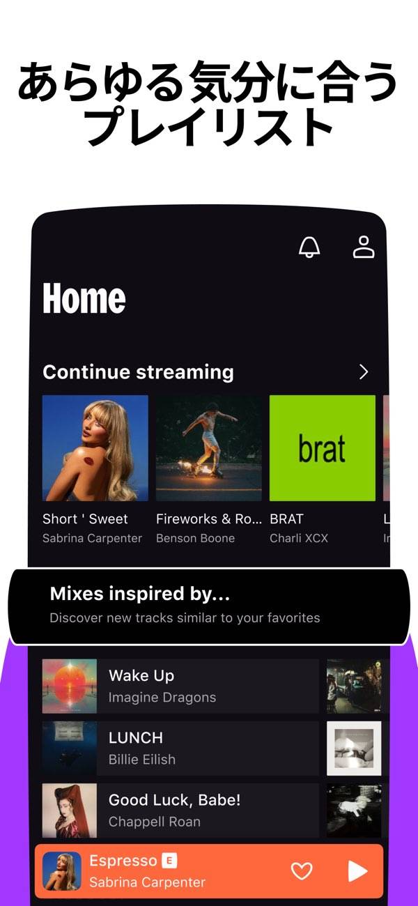 9,000万曲を超える、ロスレス音質の楽曲を配信。邦楽から洋楽まで幅広く、CD並の高音質で楽しめます。既存のサブスクサービスの音質では満足できない、という人には特におすすめです。
