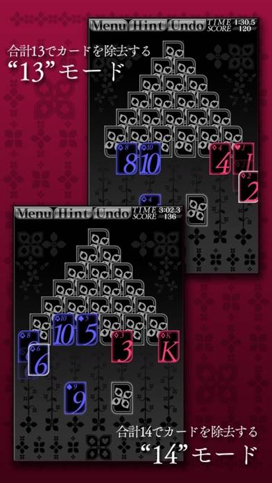 ここでは「13モード」のカード表バージョンでプレイしてみましょう。ピラミッドのように配置されたカードの一番下の部分だけを動かすことができます。カードをドラッグして重ね、合計数が13ならばそのカードは消えるのですが、キングのカードはもともと13なのでタップするだけで消えます。