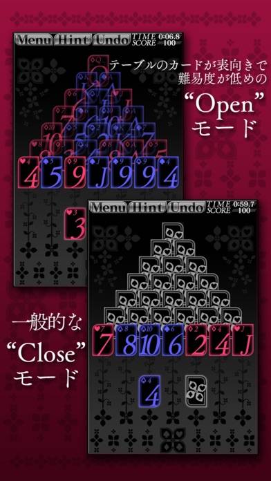 ソリティアのルールの一種「ピラミッド」を遊ぶことが出来るアプリです。少し珍しいルールなので、通常のソリティアに慣れた人にとっては新鮮に思えるはずです。しかし基本的な部分は変わらないので、「ちょっと変わったソリティアを楽しみたい」という方にはぴったりのアプリですね。親切なヒント機能もついているので、戸惑うこともないでしょう。