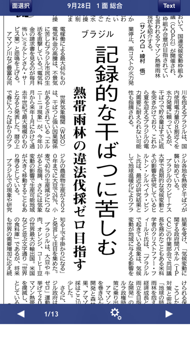 紙面の各記事の内容はテキスト形式で読めるため、スマホでも快適です。PDFのレイアウトでも拡大すれば読めますが、こちらは多くのウェブ記事と同じ横書き表示なので、普段スマホで接する文章により近いのが特長。画像は表示されないため、PDFと使い分けましょう。