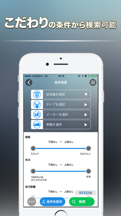 価格や色・走行距離など細かな条件で絞り込んで検索することも可能です。特に中古バイクの場合、過去の修復歴や使用履歴も把握できるため安心して選ぶことができますよ。また直感的な操作性も魅力的で、タップとスライドのみで条件を指定できます。