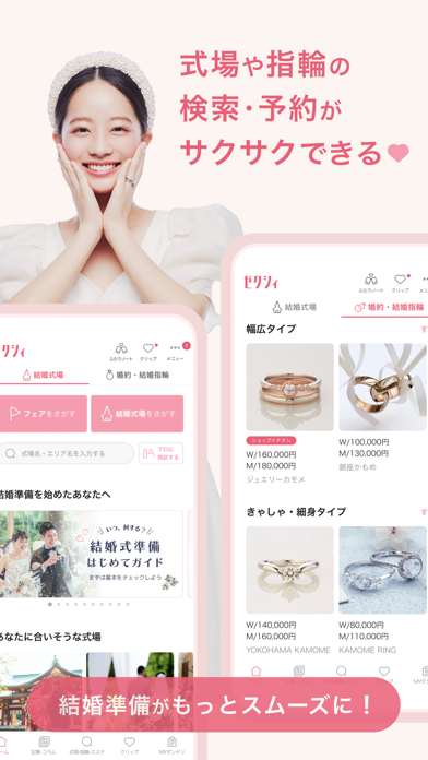 地域やスタイルに合わせた結婚式場や指輪を探せます。また記事やコラムで結婚準備や指輪探しについての情報を得ることも可能。さらに見学予約やブライダルフェアの申し込みもアプリから簡単に行うことができるので、結婚式の準備を効率よく行えます。