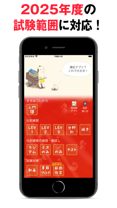 2024年度の試験範囲の改定(収益認識基準など)に対応しています。こちらで確認した限りでは、前年では2023年度となっていたため、2025年度以降も対応の可能性大。紙の試験とネット試験の両対応。このアプリひとつでどちらの対策も行えます。