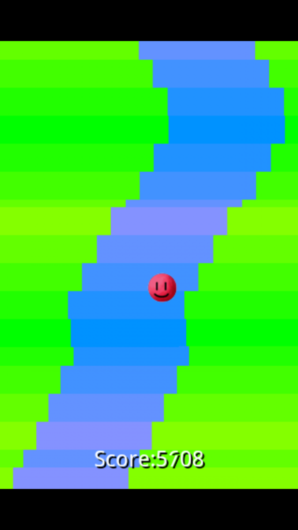 赤いボールはくねくねと曲がる川をひたすら下っています。プレイヤーはスマホを右に左に傾けつつボールを操作し、ひたすら川を下ります。このとき、注意しなければならないのは、岸との接触です。