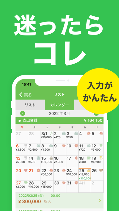 円グラフやカレンダーなどで、自分の出費をひと目で確認できます。