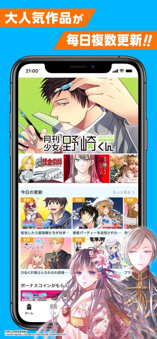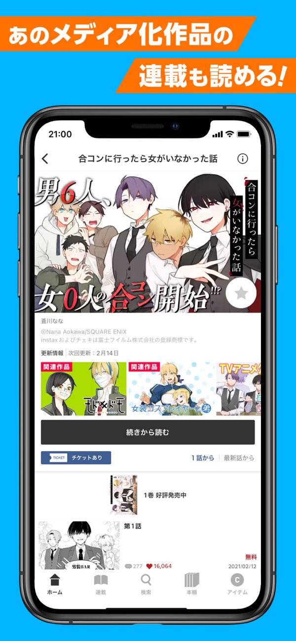 毎日新作の漫画が無料で楽しめるスクウェア・エニックスの漫画アプリです。多数のオリジナル作品や人気作家の新連載が掲載され、待つと無料で読める機能を搭載しています。